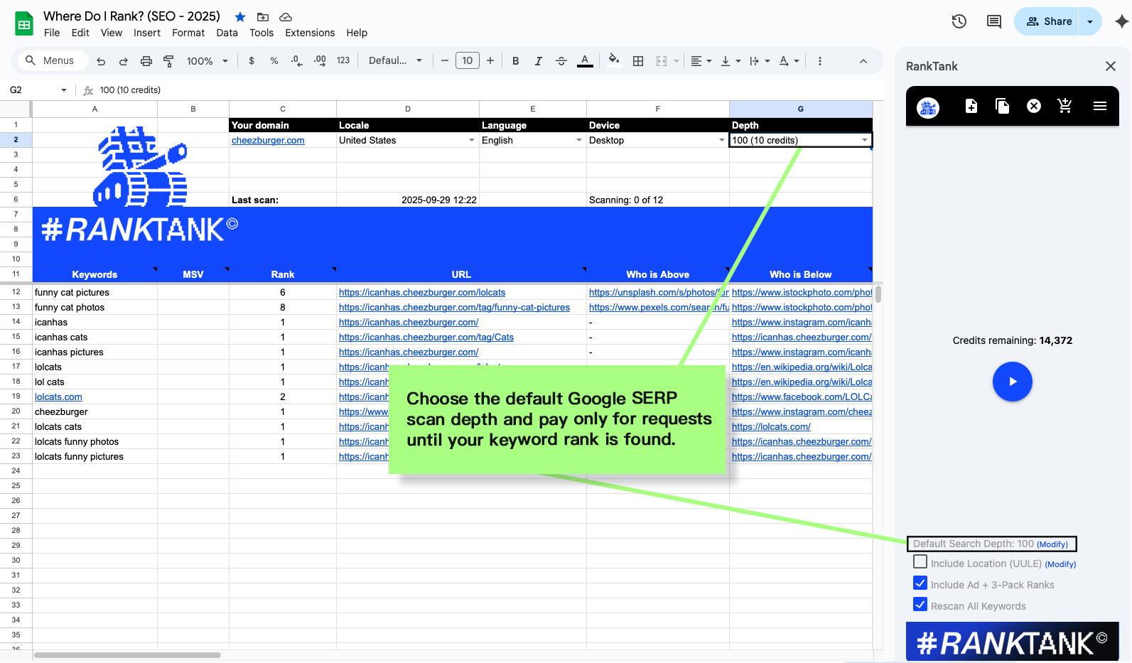 At RankTank, when using the new RankTank Google Sheet Extension, we have decided to only scan Google pages until your keyword is found. This means your credit usage will be dynamic. The extension will show you the credits used per keyword as well as the total and you may adjust the depth parameter in order to decide whether to search deeper into Google SERPs, consuming more credits.